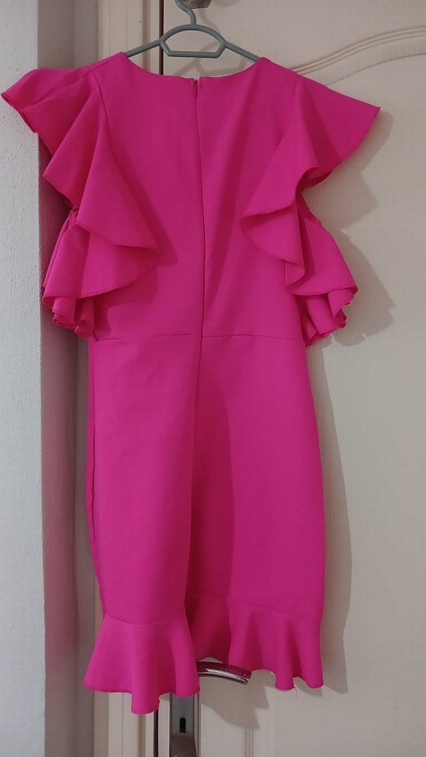 Pembe, ideal boyda ve vücuda oturan elbise, V yaka ve kol ile etek uçlarında fırfır detaylarına sahiptir. ✨ BOYU 86 CM'DİR. TEMİZDİR.