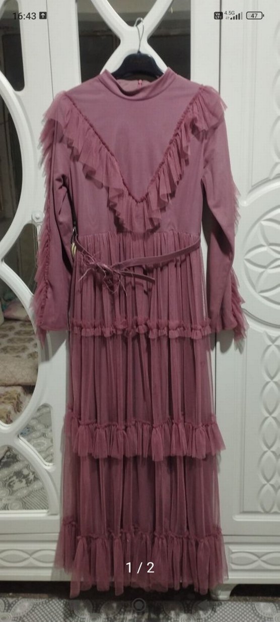 Pembe renkli, yumuşak sentetik kumaştan yapılmış, fırfırlı ve bol kesim uzun elbisedir. V yaka ve askılı kolludur, bohem tarzı ve düğünler için uygundur.