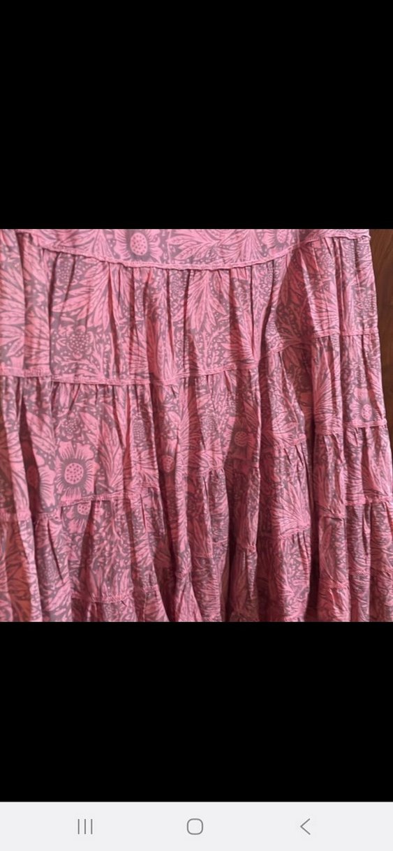 Pembe renkte, koyu tonlu batik desenli, bol kesim ve fırfırlı detaylara sahip midi boy bohem etek. bir iki kez giyilmiştir.