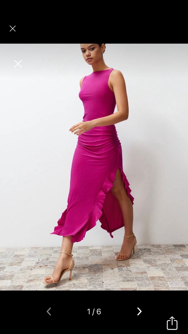 Yüksek yakalı, yan yırtmaçta fırfır detaylı, uzun ve gövdeye oturan elbise. Parlak sentetik kumaştan, kolsuz ve gösterişli romantik akşamlar için uygundur.