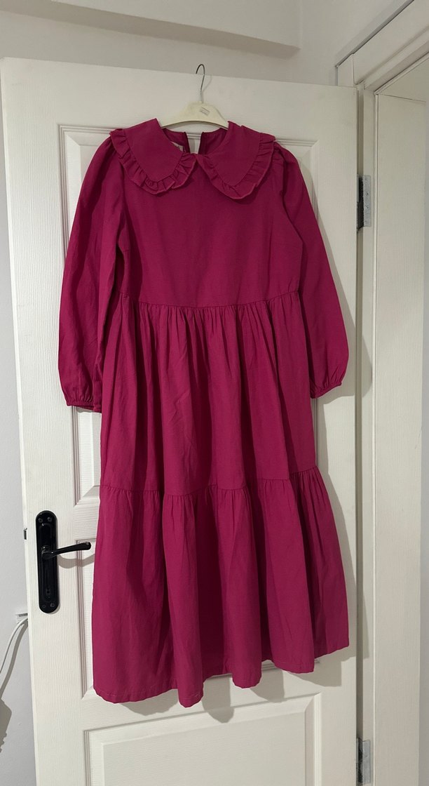 Bordo keten kumaştan yapılmış, uzun ve bol kesim elbise. Uzun kollu, fırfırlı yakasıyla vintage ve bohem tarzı yansıtır.