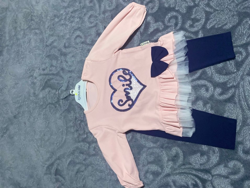 Pastel pembe uzun kollu bebek kız takımı, fırfırlı detaylar ve baskılı kalp deseni ile, lacivert fiyonk süslemeli. Yumuşak ve rahat kumaş.