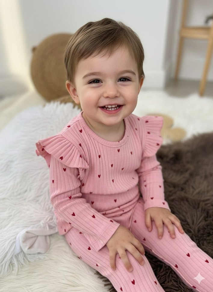 Pastel pembe renkte, uzun kollu ve fırfırlı detaylı, kalp desenli bebek kız takımı. Yumuşak kumaşıyla rahatlık sağlar. yaş Grubu için iletişime geçiniz