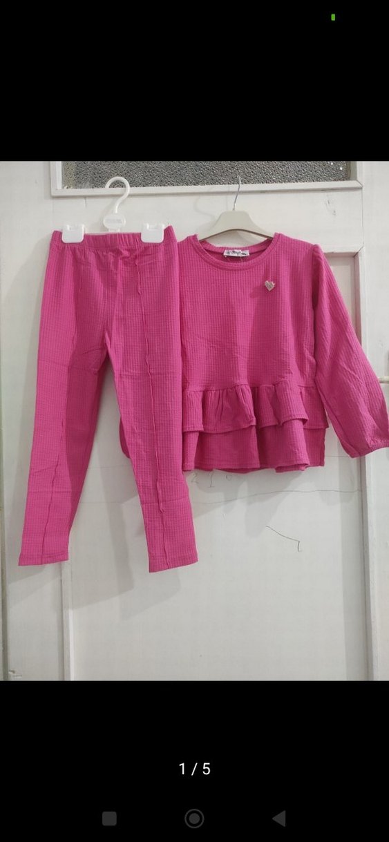 Uzun kollu, fırfırlı üst ve uyumlu pantolondan oluşan canlı pembe bebek kız takımı. Kumaşı yumuşak ve rahat dokuludur.