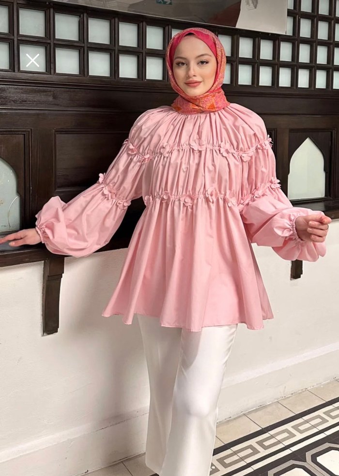 Yumuşak pamuktan yapılmış, yüksek yaka ve uzun kollu, bol kesim pembe fırfırlı uzun tunik. Pastel tonlarda batik desenlidir, günlük kullanıma uygundur.