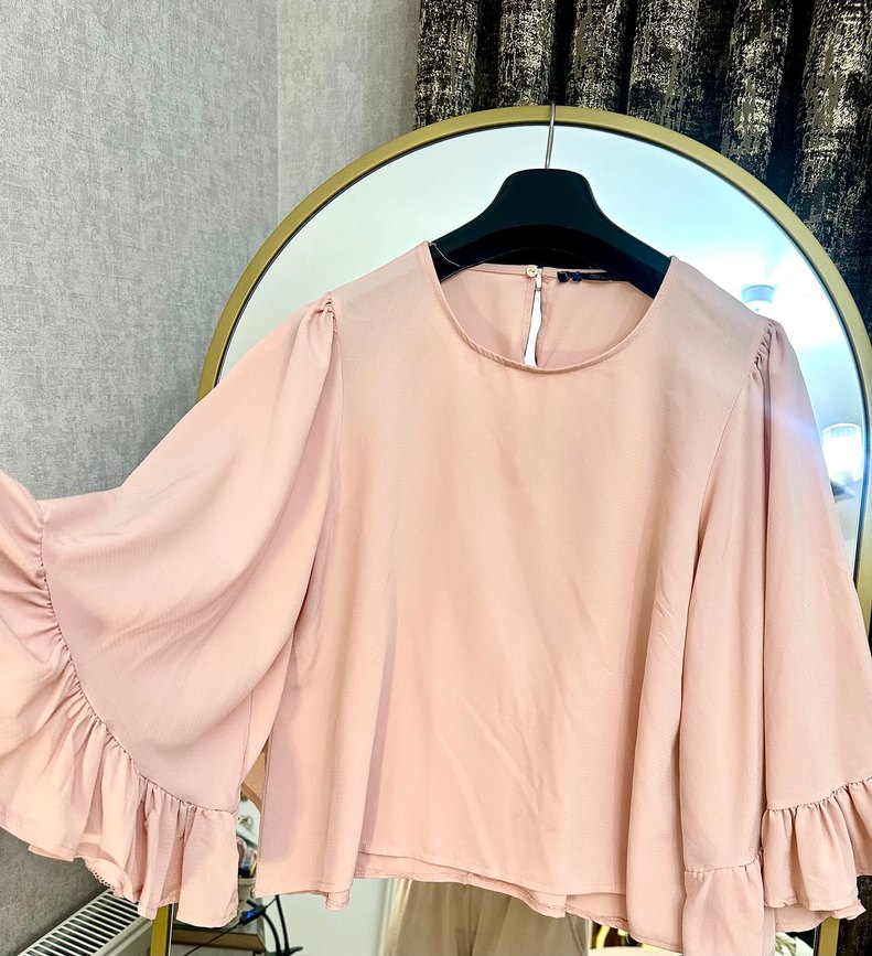Bol kesim, yuvarlak yaka ve uzun kollu bu kadın bluz pembe pastel renkte. Fırfır detaylarıyla günlük kullanıma uygundur. Ofis stilinde kolay kombinlemek için harikadır. Hiç kullanılmadı.