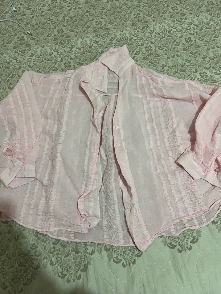 Pastel pembe keten gömlek, uzun kollu ve yakalı, bol kesim ve fırfır detaylı. Midi boy, vintage bohem tarzda günlük kullanıma uygun.