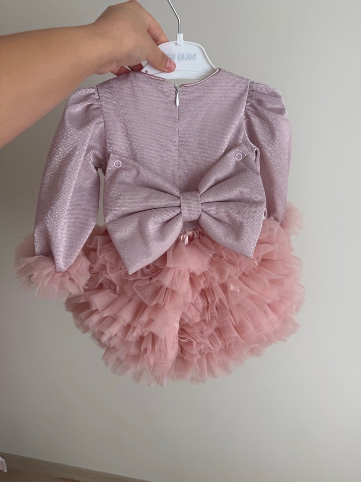 Pembe renkli, uzun kollu ve bisiklet yaka kız çocuk elbisesi. Sırtında büyük fiyonk ve çok katmanlı fırfırlı etek detayı bulunur.