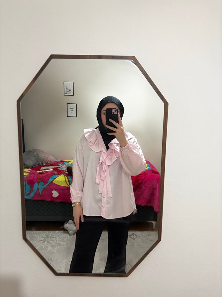 Salaş kesim, midi boy, pastel pembe renkli, ipeksi dokulu, uzun kollu, halter yaka, fırfır detaylı ve hafif batik desenli bluz. Trendy gündelik tarz için uygun. Bir düğmesi eksik alt kısmın bir üstü ama o kadar belli değil