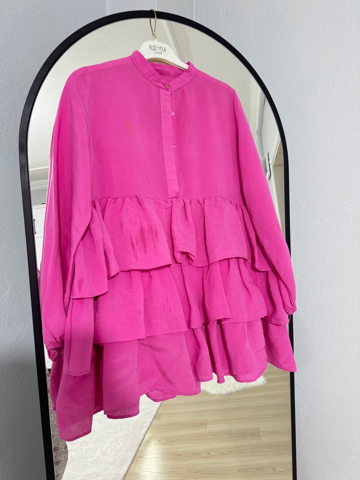 Pembe renkli, uzun kollu, yüksek yakalı İpek gibi kumaştan, kısa boyda ve fırfır detaylıdır. Bohem Paris tarzında, batik desenlidir. Günlük kullanıma uygun.