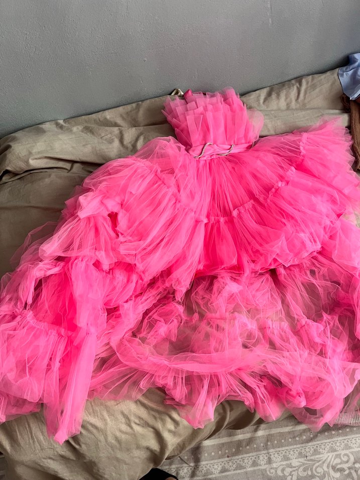 Straplez yaka ve ince askılı, pembe uzun elbise. Fırfır detaylarıyla hacim kazandırılmış, avant-garde ve pop kültür tarzına uygu
