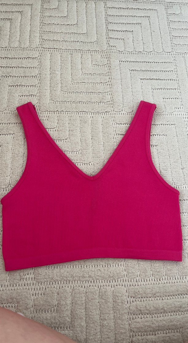 Açık pembe, derin V yakalı ve geniş askılı, düz dokulu sporcu bralet. Hiç kullanılmamıştır standart bedendir