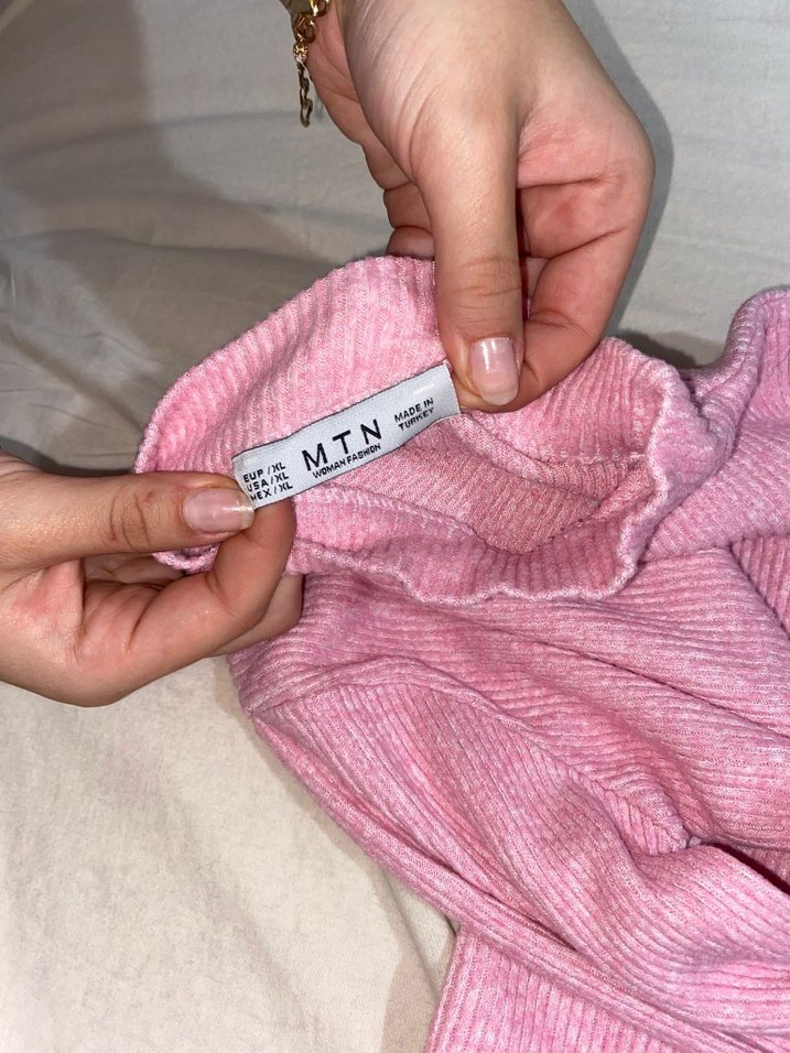 Pembe fitilli triko kadın kazak, uzun kollu ve yuvarlak yaka tasarıma sahiptir. Crop tarzıdır bedeni xl olmasına rağmen küçük bedenlere uyar