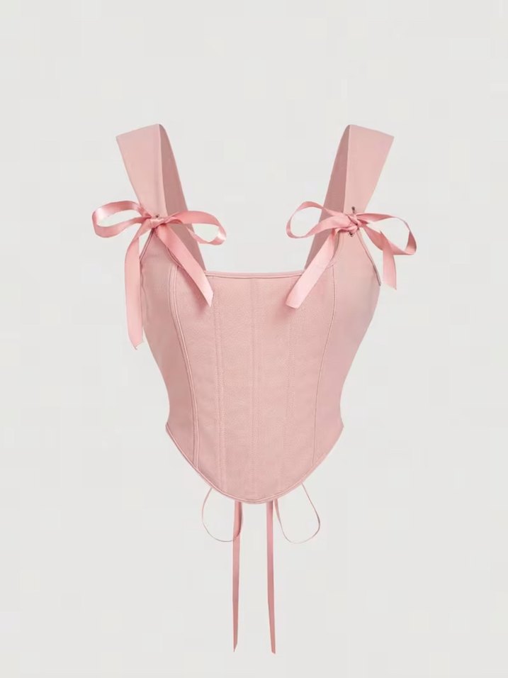 Pembe renkli, askılı ve fiyonk detaylı, straplez yakalı, vücuda oturan sentetik kumaş bustiyer. Bohem tarzda parti için uygun.