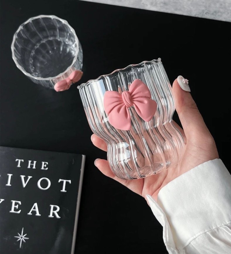 Dalgalı yapıya sahip, pembe fiyonk detaylı şeffaf bardak.