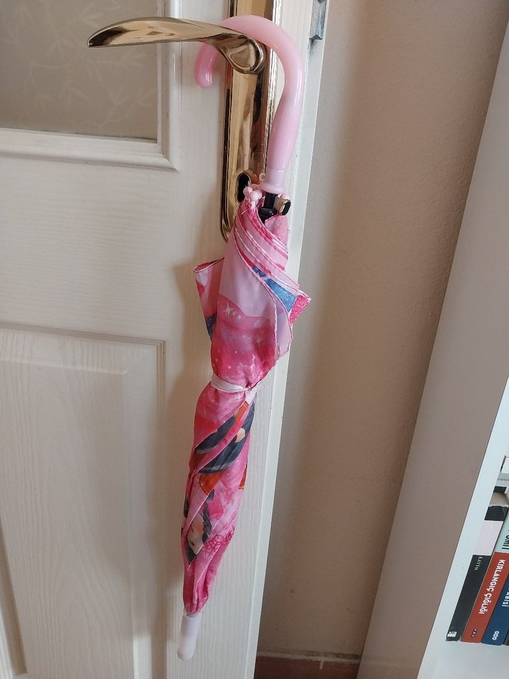 Pastel pembe renkte, fiyonk detaylı ve bohem tarzda çocuk şemsiyesi. (cirt cirti çalışmıyor)