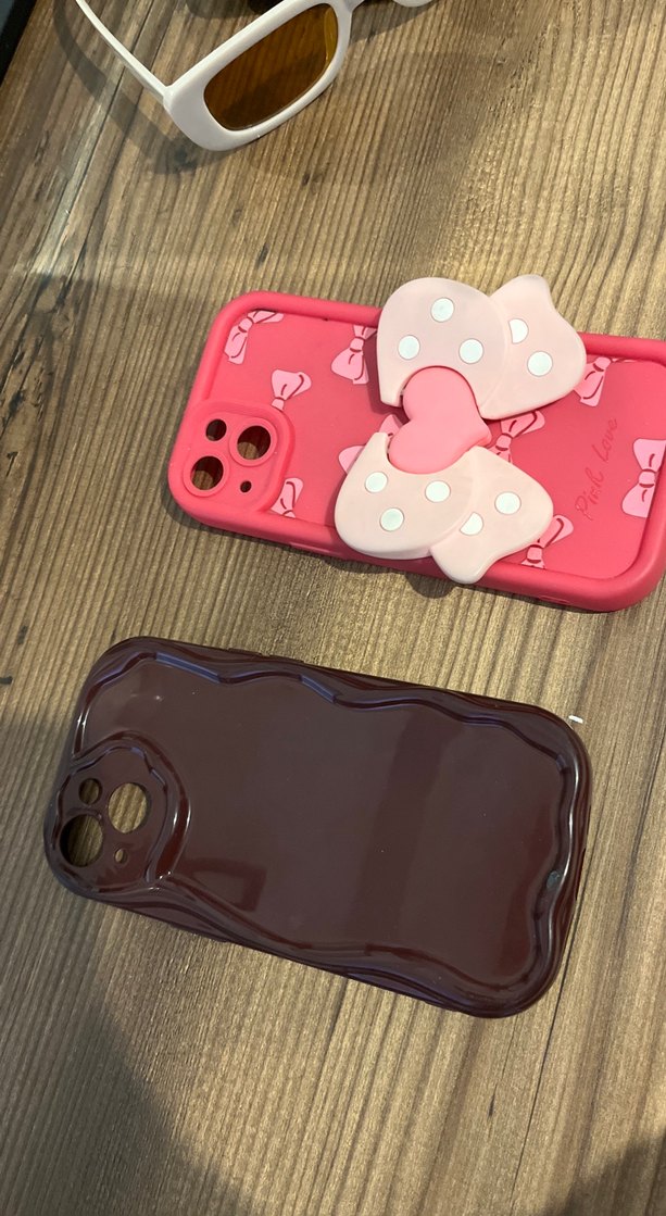 Koyu pembe renkte, fiyonk desenli ve arka kısmında büyük puanlı fiyonk detaylı bohem tarzda telefon kılıfı.