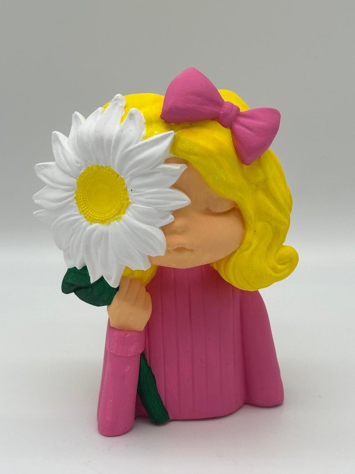 Sarı saçlı, pembe fiyonk takan kız figürünün elinde büyük beyaz ve sarı çiçek bulunuyor.