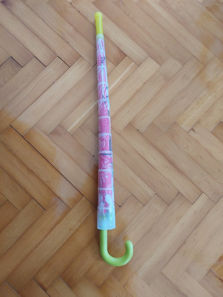 Yeşil kavisli saplı, pembe fiyonk detaylı pastel renk çocuk şemsiyesi, retro ve bohem tarzda ☂️