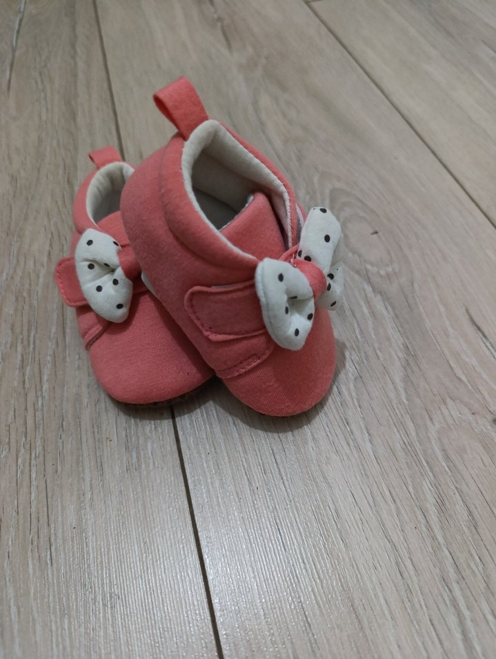 Pembe renkli, yumuşak kauçuk tabanlı kız çocuk ilk adım ayakkabısı, siyah puantiyeli beyaz fiyonk detaylıdır.