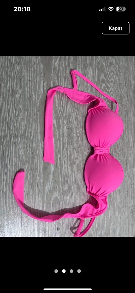 Pembe renkli, fiyonk detaylı ve strappy askılı bu bikini üstü, cesur ve minimal tarzda, normal boydadır.