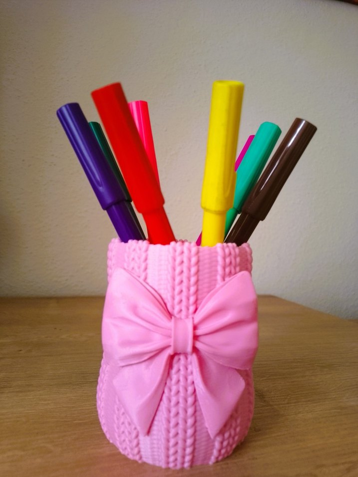 Pembe fiyonk detaylı, örgü desenli kalemlik. İçinde renkli keçeli kalemler bulunur. ✏️kalemler dahil değildir.