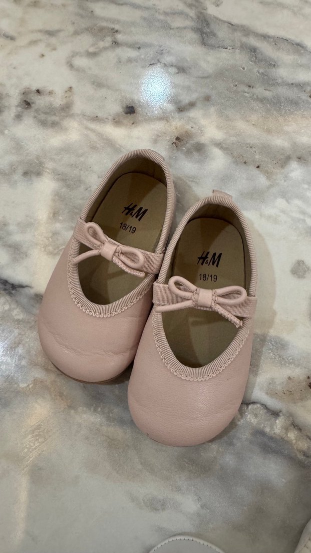 Pastel pembe renkte, fiyonk detaylı kız çocuk babetleri. Lastik malzemeden, sade ve basic tarzda. H&M, 18/19 numara. Çok iyi durumda bir kaç kez giyildi