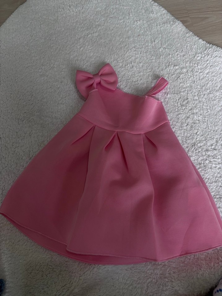 Pembe, straplez yaka, salaş kesim kız çocuk elbisesi, fiyonk detayıyla modern klasik tarzda.