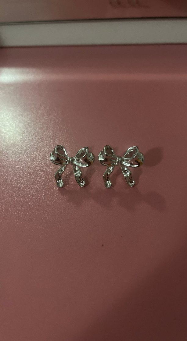 Pastel pembe fiyonk detaylı, midi uzunlukta, desen içermeyen küpeler. Düğün ve sokak stiline uygun sade tasarım.