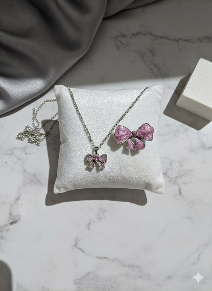 Pembe Fiyonk Detaylı Mini Kolye ve büyük fiyonk yüzük