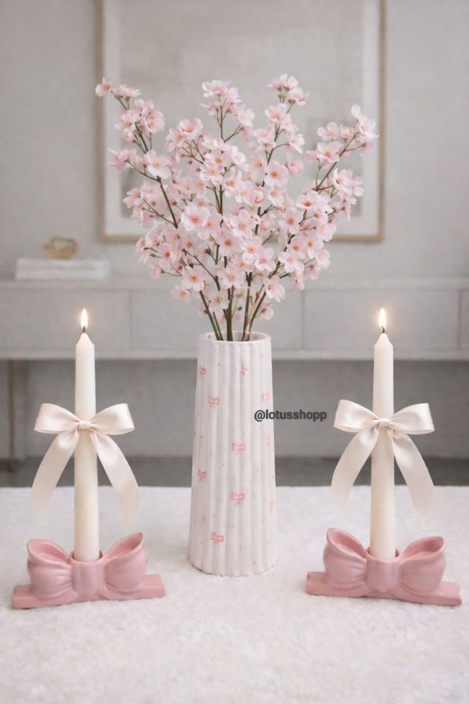 Pastel pembe fiyonk şeklinde iki mumluk ve beyaz mumlar, Mekâna zarif ve yumuşak bir hava katar. ️
