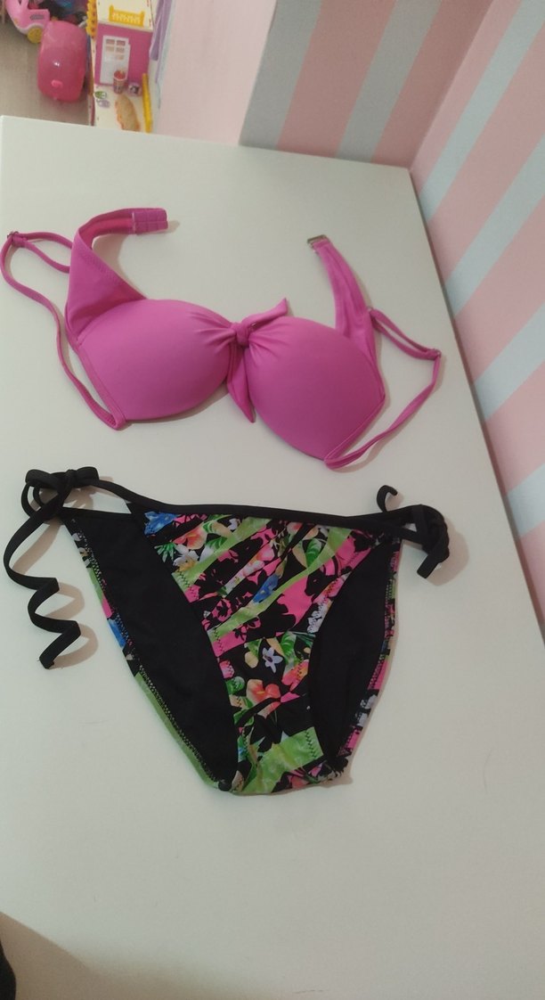 Pembe fiyonk detaylı, askılı üst ve renkli desenli yan bağlamalı mini alt bikini. Cesur ve bohem tarzda, plaj için uygundur.