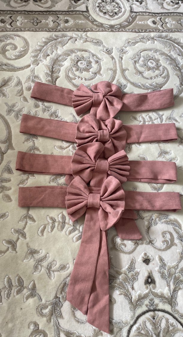 Yumuşak sentetik kumaştan yapılmış pastel pembe sandalye kemerleri, her biri büyük fiyonk detayıyla bohem tarzını yansıtıyor.