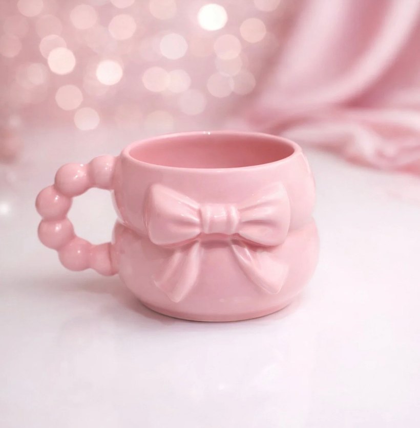 Pastel pembe renkte, ön yüzünde kabartma fiyonk detayı bulunan, boncuklu kulplu seramik kupa. Zarif ve şık bir tasarıma sahiptir. ☕