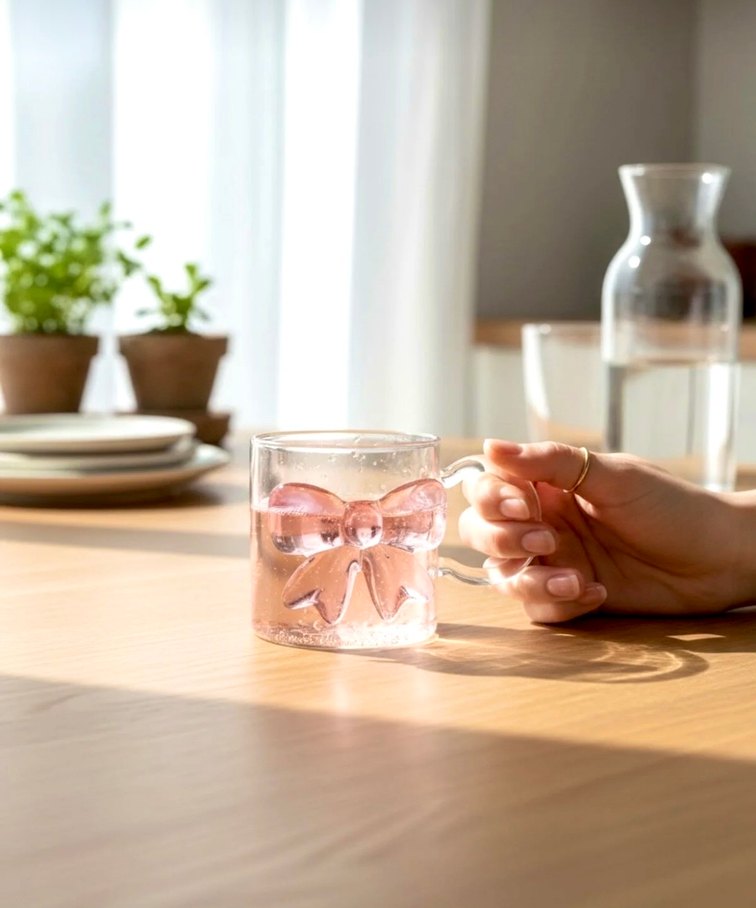 Pembe Fiyonk Kurdele Detaylı Cam Kupa