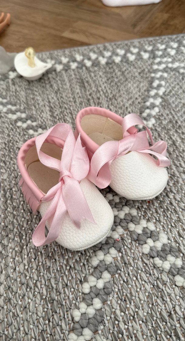 Yumuşak pastel pembe ve beyaz renkli, fiyonklu, esnek kauçuk malzemeden yapılmış bebek ilk adım ayakkabısı.
