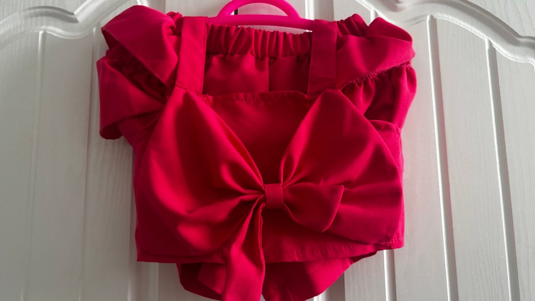 Kırmızı renkte büyük fiyonk detaylı, düz kumaştan bebek kız tulumu. Rahat ve renkli tasarım.