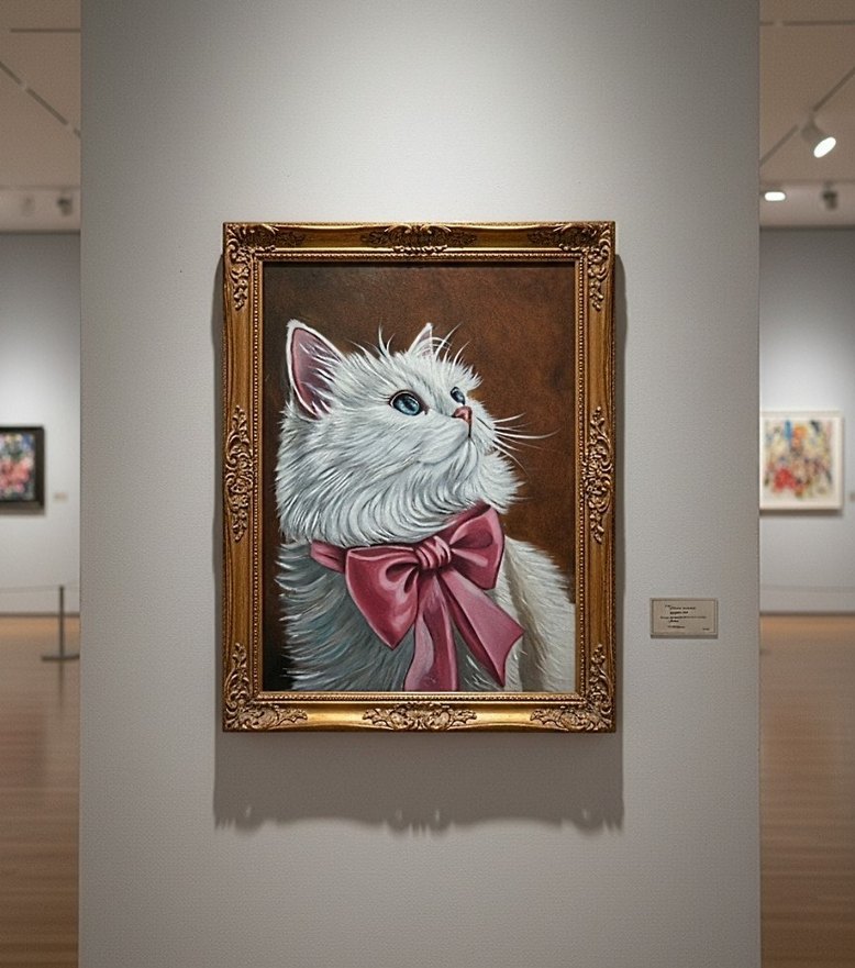 Pembe Fiyonklu Beyaz Kedi Yağlı Boya Tablo