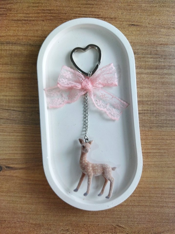 lütfen ilan actiriniz.Kalp şeklinde halkası, ince dantel fiyonk ve küçük geyik figürü ile pastel pembe, bohem Parisian tarzında anahtarlık .