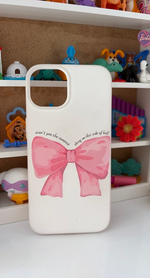 Bu telefon kılıfı, büyük pastel pembe fiyonk ve bohem stilde tasarlanmıştır. Fiyonkun etrafında "aren't you the sweetest thing on this side of hell" yazısı bulunur. İphone 15 uygundur.