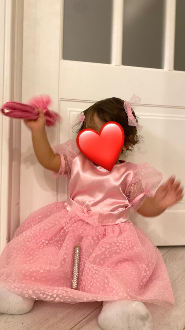 Pembe, fiyonklu, V yaka ve askılı, yumuşak sentetik kumaştan yapılmış çocuk elbisesi. Moda tutkunları için uygun.