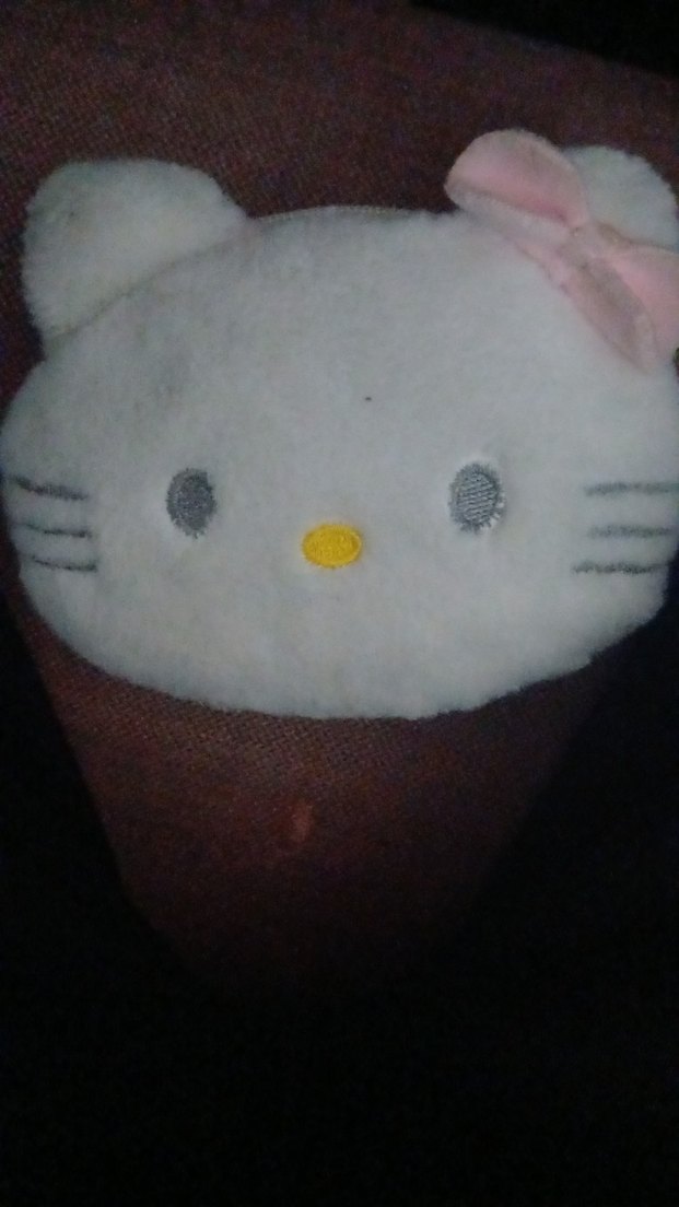 Pembe fiyonk detaylı, gri renkte, kedi yüzü şeklinde yumuşak peluş oyuncak.Cüzdan hello kitty.