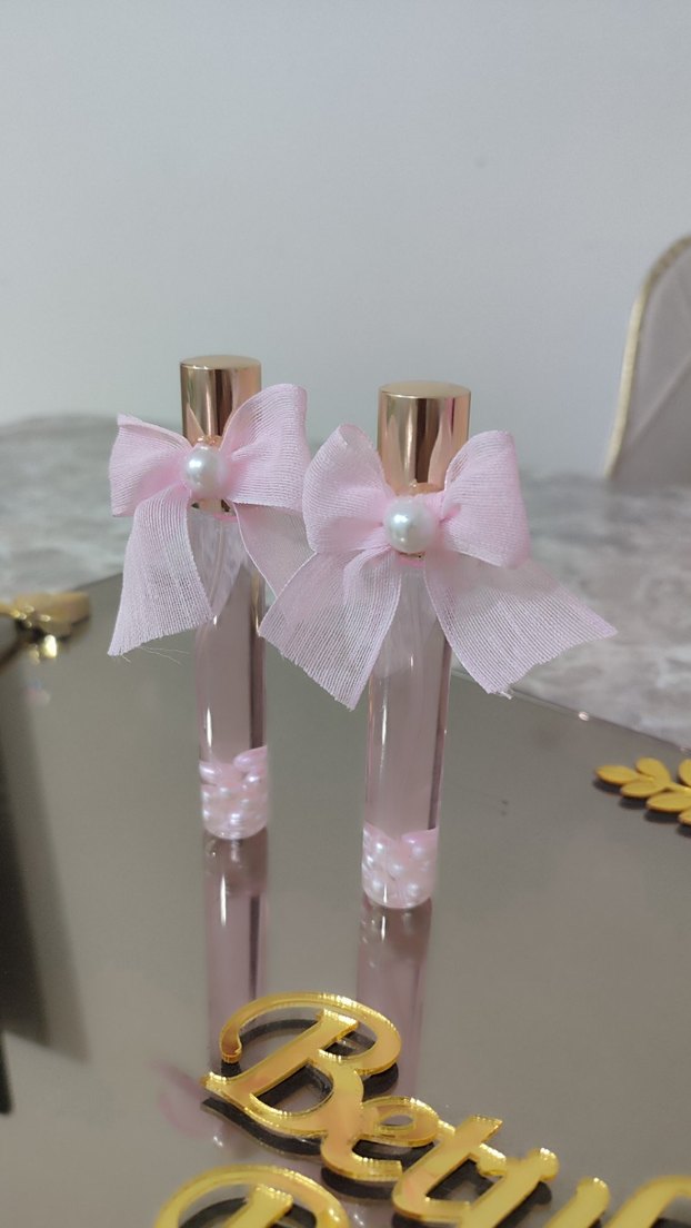 Pastel pembe renkte, inci detaylı ve fiyonk süslemeli şık parfüm şişeleri