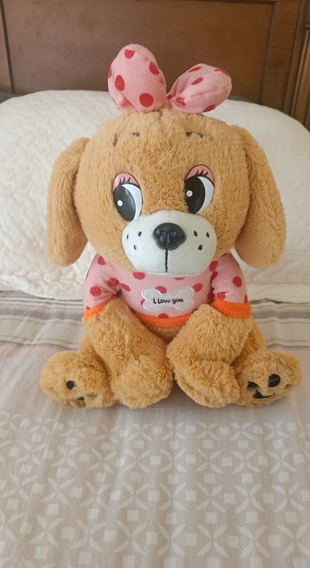 Kahverengi peluş köpek oyuncak, pembe fiyonk ve üzerinde "I love you" yazılı pastel pembe tişört ile birlikte. Yumuşak ve sevimli bir hediye seçeneği.