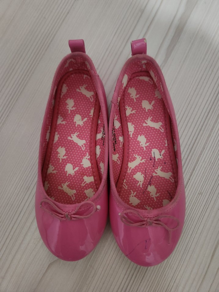 Pembe renkli, fiyonklu kız babet ayakkabı. İç kısmında sevimli hayvan desenleri bulunur. Yumuşak ve parlak yüzeye sahip, rahat ve renkli tasarım.