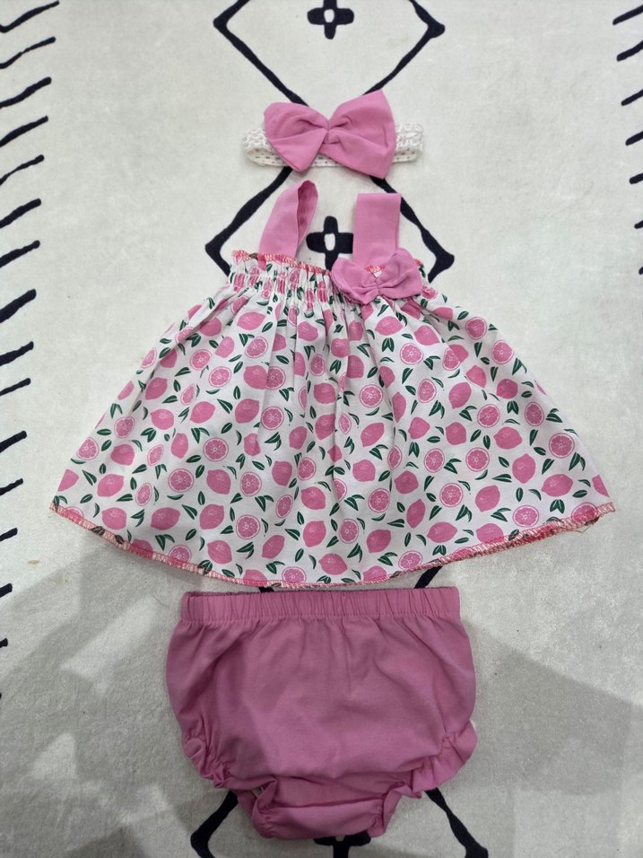 Renkli pembe bağcıklı üst, fiyonk detaylı ve uyumlu şortlu kız bebek kıyafet takımı. Fiyonk saç bandı dahildir.
