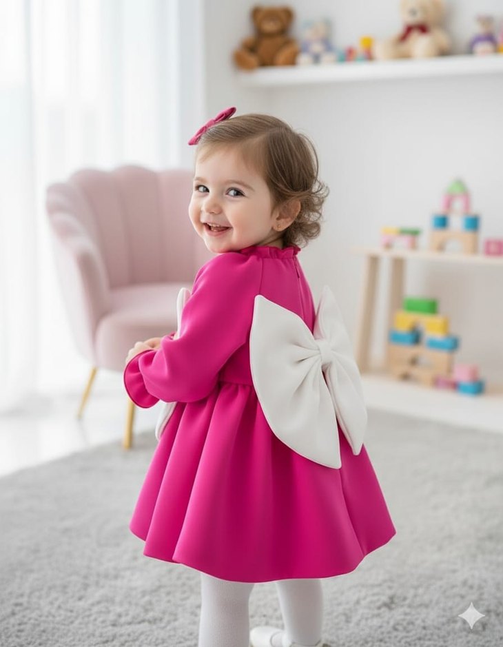 Renkli pembe kız çocuk elbisesi, uzun kollu ve fitted kesimdir. Yumuşak puf panda kumaştan yapılmıştır, arka kısmında büyük beyaz fiyonk ve baskılı desene sahiptir. istenilen yaşlar hazirlanilir