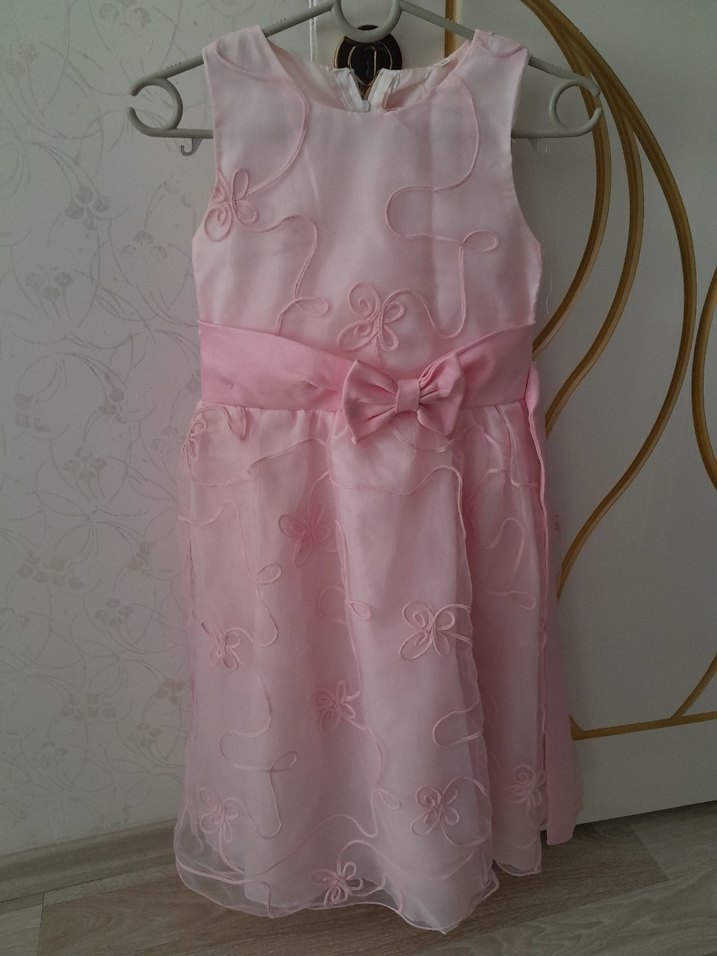 Pembe, nakışlı çiçek desenli, fiyonklu ve straplez yakalı kız çocuk elbisesi. Pastel tonlarda, klasik bohem tarzda, yumuşak sentetik kumaştan, fitted kesim.