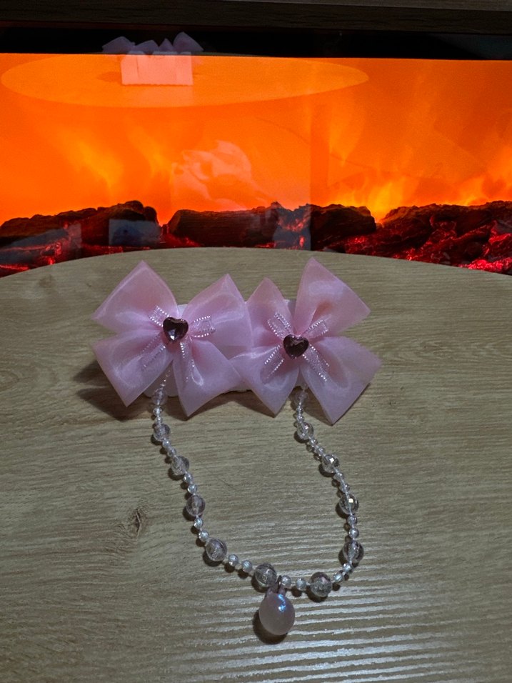 pastel pembe fiyonklar, boncuklu zincir ve damla şeklinde toka bohem bir tarz sunar.