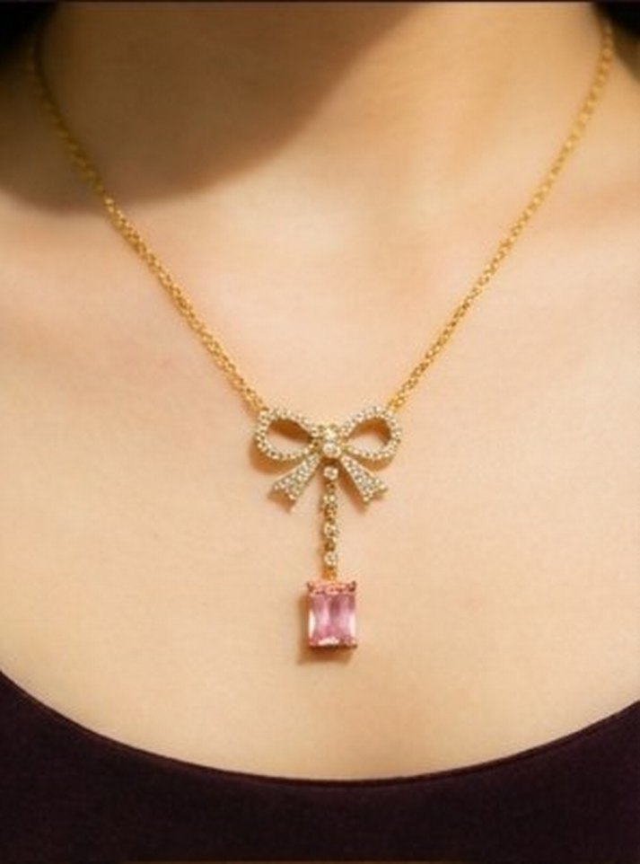 Altın tonlu bu kolye, küçük kristallerle süslenmiş fiyonk şeklinde bir kolye ucu ve sarkan pembe taş ile zarif bir görünüm sunar. Midi uzunluğu boyunda durur, romantik akşamlar için uygundur.